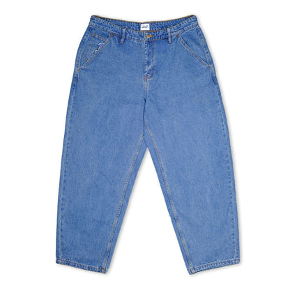 Baggy-fit denim 5-pocket pants with embroidered rear pocket graphics, logo jacron, satin applique graphic on coin pocket, blue pocket bags, and embossed metal logo button.